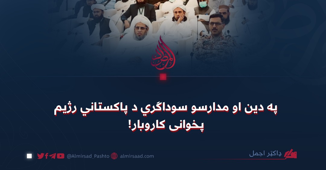 د پاکستاني رژيم له لوري پر دیني ارزښتونو او په خپله خوښه جوړو کړو مدرسو سیاسي سوداګري څه نوې خبره نه ده، د دغه هېواد پوځي واکمنو او د ملکي حکومتونو ګوښه کوونکو دیکتاتورانو د خپل واک، شخصي ګټو او نړیوالو ظالمانو معاملو لپاره تل هڅه کړې ده چې د خپل تداوم لپاره له دین څخه هم ناوړه استفاده وکړي، په خپله خوښه مفتیان او مدرسې جوړې او بیا یې خپلې سیکولرې نظریې او سیاست ته د دیني اړخ ورکولو لپاره وکاروي، چې تر ټولو وروستی مورد یې هم د جامعه رشید په نامه مفتیانو له لوري د هغه پوځي او پوځي چارواکو نمانځنه یا ستاینه وه چې لاسونه یې د خپل ملت او سلګونه بې ګناه وګړو په وینو سره دي او د نړیوالې ترهګرۍ، داعش خوارجو او نورو فتنو لپاره شپه ورځ د پردیو په خدمت کې لګیا دي.